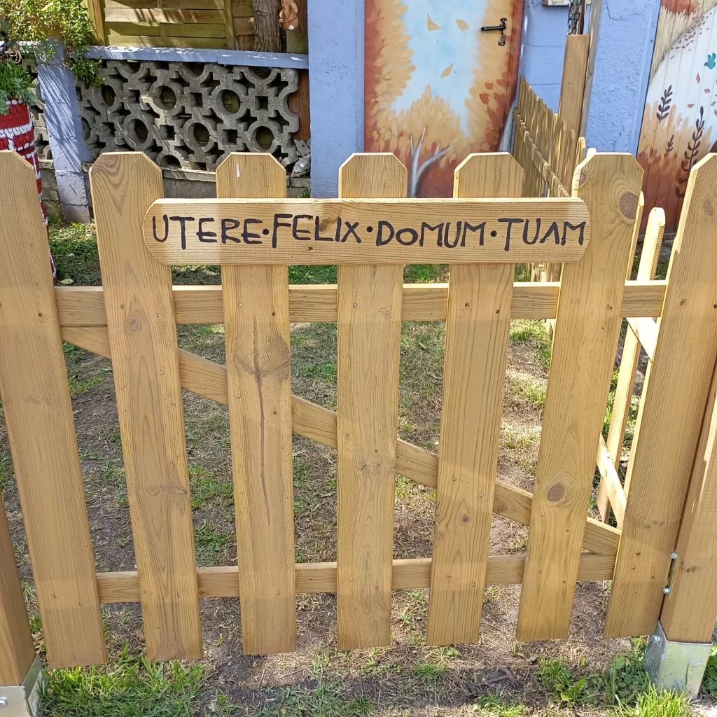 La guía nos explicó que significa «que uses felizmente tu casa» o «disfruta de tu casa». Y me pareció una frase preciosa para adornar la entrada a La Seronda. Aprovechamos una de las tablas que habíamos cortado para hacer el cierre que veis en la foto, y con ayuda del programa Dafont pinté las letras.